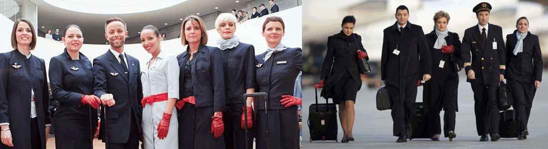 Các tiếp viên của Air France mặc đồng phục màu black. Đồng phục của tiếp viên nam gồm white shirt, black tie, black suit và black trousers. Với tiếp viên nữ, họ mặc white shirt, black suit, gray scarf và black skirt làm đồng phục.